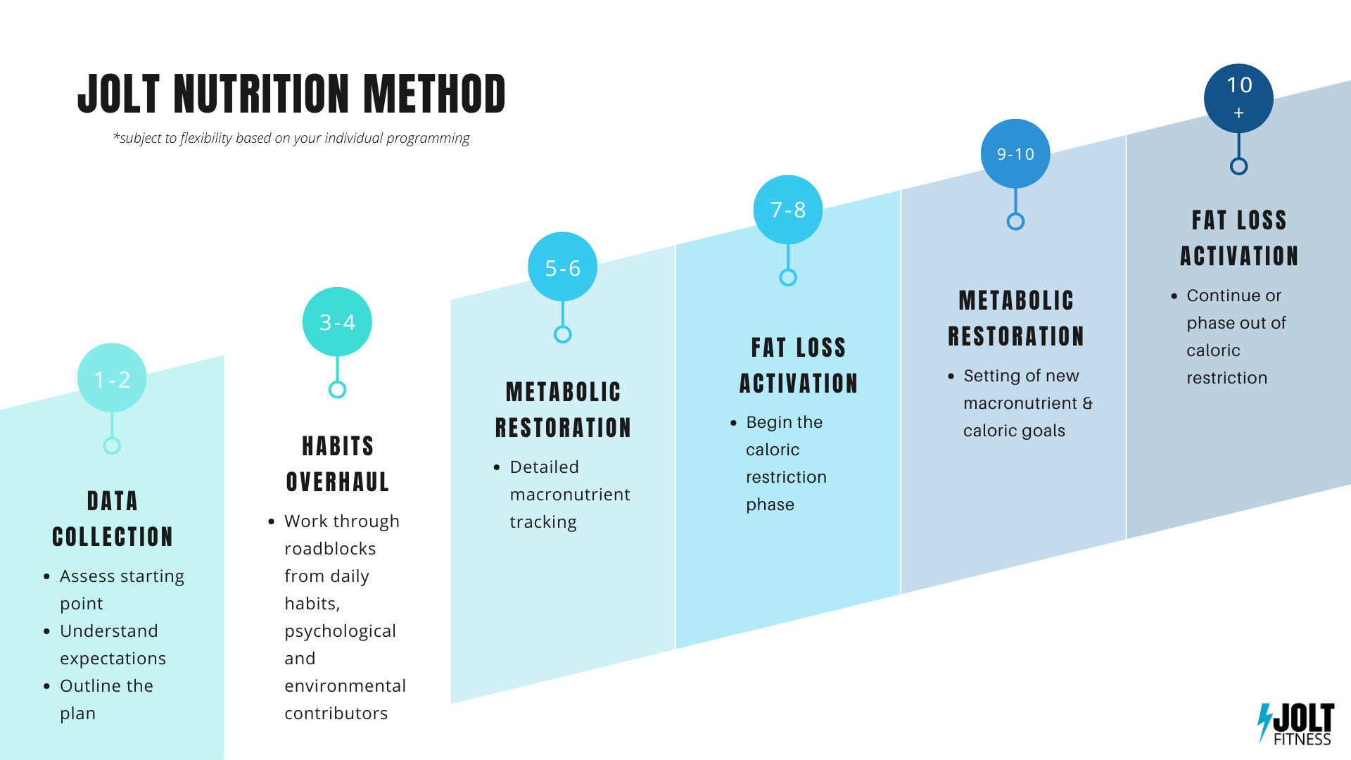 8 × 30 minute sessions to get started in Jolt Nutrition Methods booked bi-weekly. This plan includes a custom strategy to achieve your goals, detailed progress tracking, on-going education & accountability.